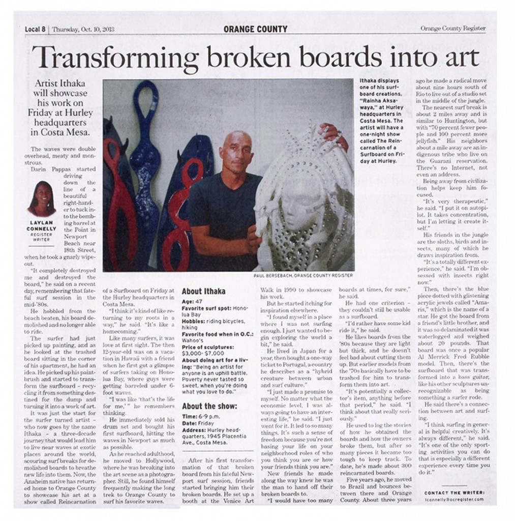 Orange County Register recently featured an outstanding article on Ithaka’s lifestory and art work, that you may also see on their website at ocregister.com/life/ and ocregister.com/entertainment/ or through the surfers agent at wayofarts.com/press/ and wayofarts.com/ithaka/