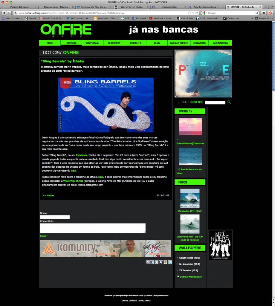ONFIRE Surf magazine featured, once again, Ithaka latest art work, with special focus on the “bling” pieces. Read more directly on ONFIRE Surf’s website at onfiresurfmag.com/noticias/ and onfiresurfmag.com/blog/ or through the surfers agent at wayofarts.com/press/ and wayofarts.com/ithaka/